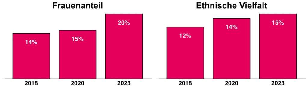 Die Vorteile von Diversität sind längst belegt. Immer mehr Unternehmen setzen diese auch in der Praxis um. Ein Blick auf die Entwicklung zeigt: Sowohl der Anteil von Frauen als auch von ethnisch diversen Personen in Geschäftsleitungen ist in den letzten Jahren kontinuierlich gestiegen – von rund 14% auf inzwischen 20% respektive von rund 12% auf inzwischen 15%.